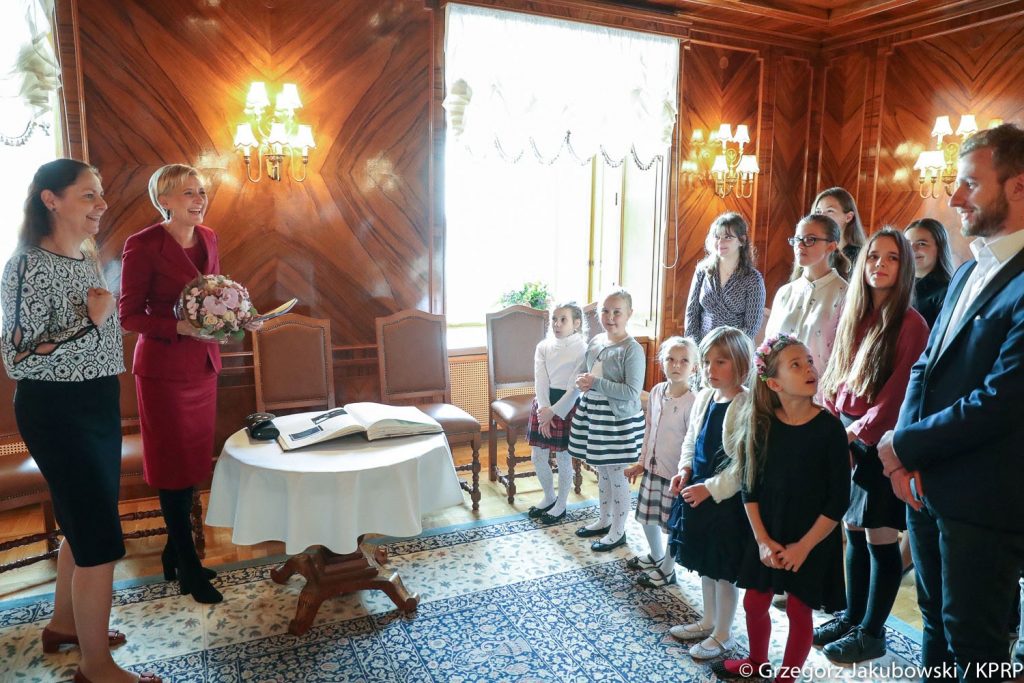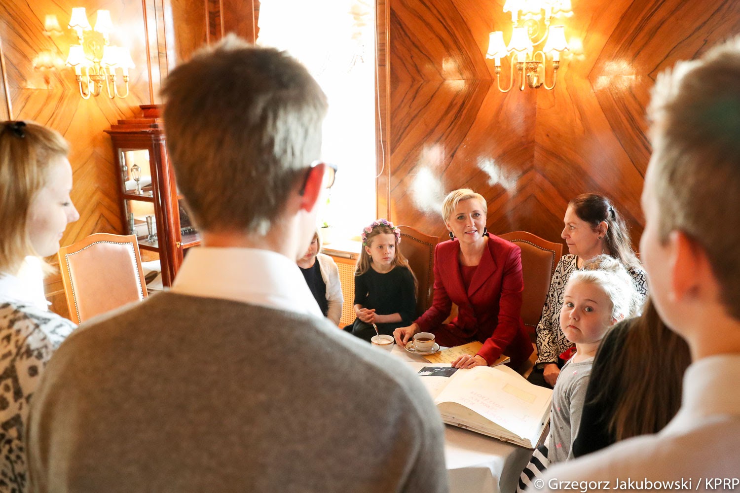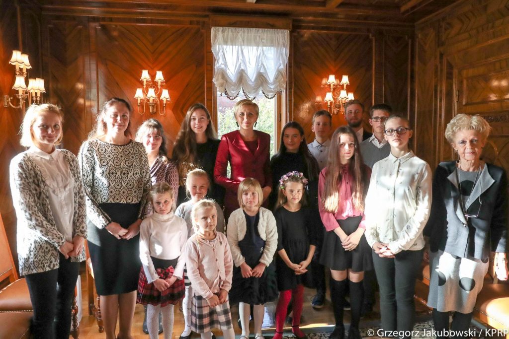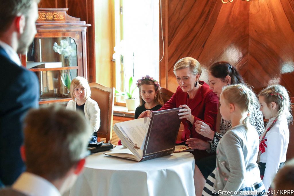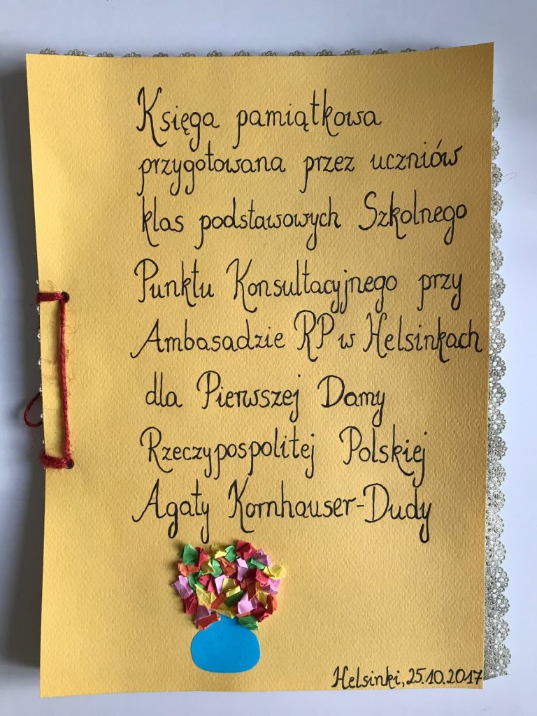 Następnie Małżonka Prezydenta spotkała się z nauczycielami i uczniami Szkolnego Punktu Konsultacyjnego przy Ambasadzie RP w Helsinkach, który realizuje uzupełniający program nauczania dla polonijnych dzieci. Pierwsza Dama została ciepło przyjęta przez uczniów, którzy pochwalili się wiedzą o polskiej kulturze i obyczajach, wyrecytowali wiersze oraz pochwalili się szkolną kroniką. Uczniowie podarowali Pierwszej Damie księgę pamiątkową przygotowaną przez uczniów klas podstawowych. Pedagodzy podzielili się z Małżonką Prezydenta swoimi doświadczeniami z zakresu prowadzonych lekcji oraz licznymi sukcesami podopiecznych w konkursach.