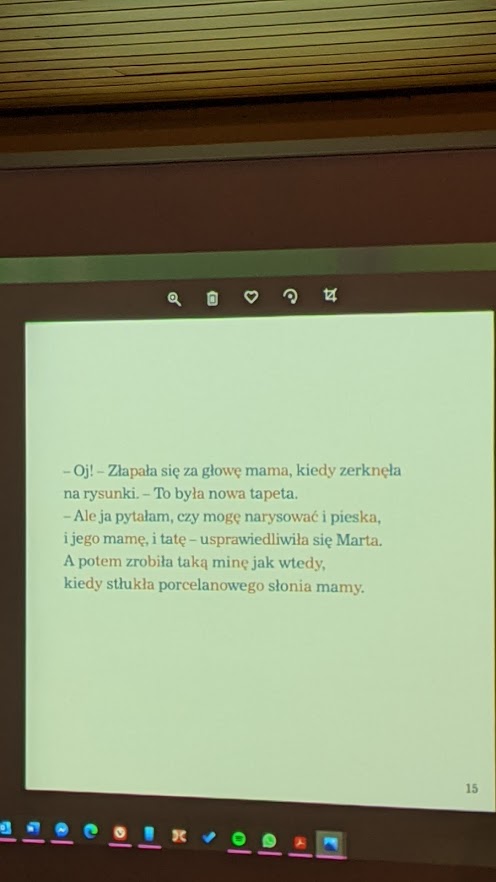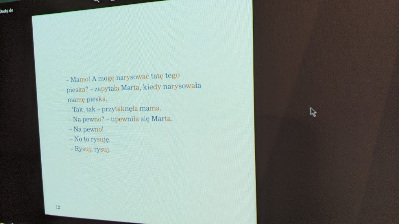 Na zajęciach poznajemy też teksty znanych polskich piosenek dla dzieci, tym razem uczyliśmy się śpiewać przeboju Fasolek, czyli piosenki „Mydło lubi zabawę”.