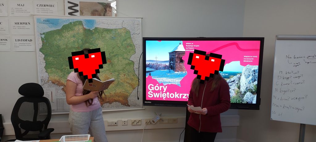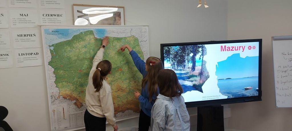 Uczniowie doskonalili również umiejętność wypowiedzi ustnej – przygotowali krótkie wystąpienia dotyczące wybranych miejsc i obiektów geograficznych w Polsce