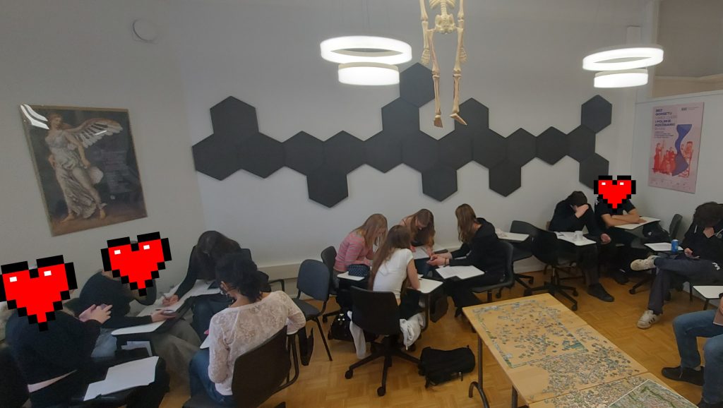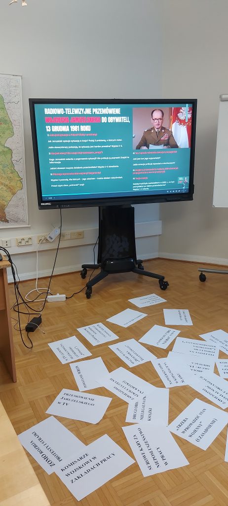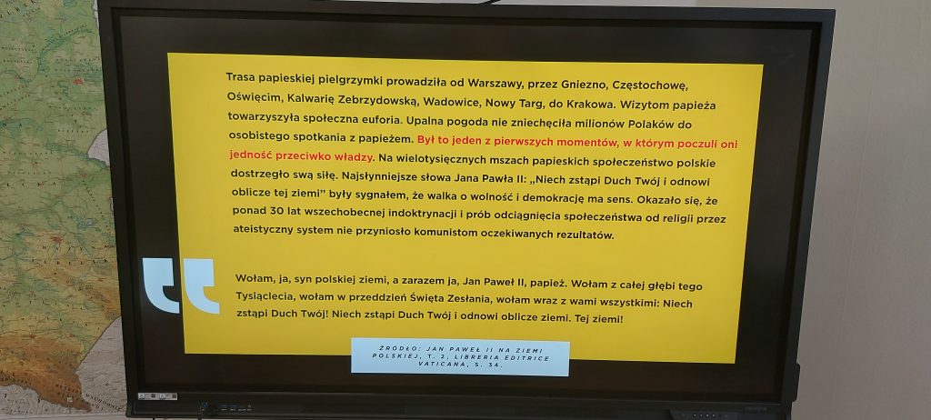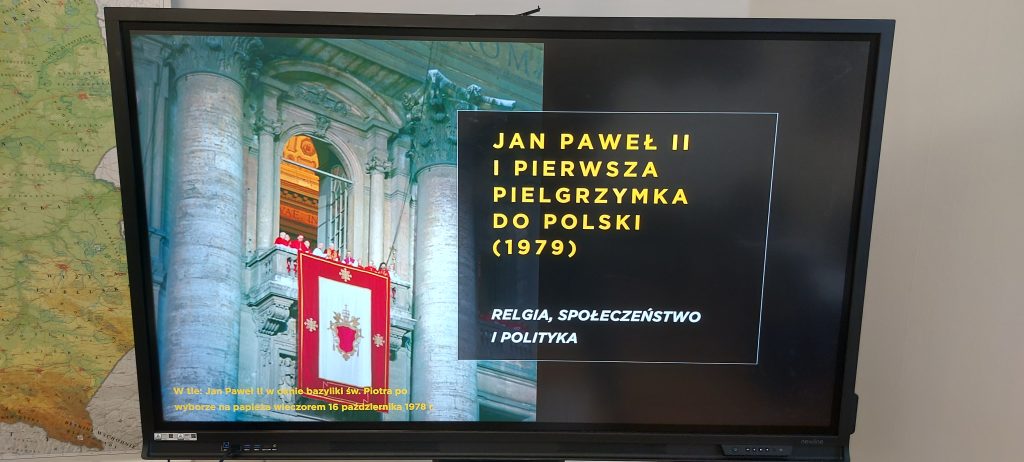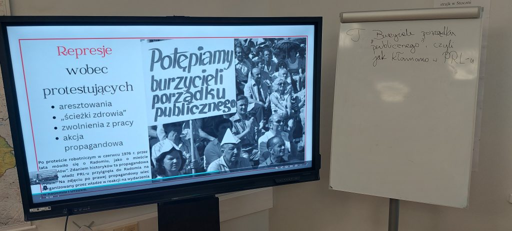 Podczas ostatniego cyklu zajęć klasa licealna zgłębiała realia PRL z przełomu lat 70. i 80. Uczniowie analizowali ówczesne przekazy prasowe i mechanizmy propagandy, poznawali okoliczności wprowadzenia stanu wojennego oraz porządkowali najważniejsze wydarzenia tego trudnego okresu. Przyjrzeliśmy się również znaczeniu wyboru Karola Wojtyły na papieża w 1978 roku oraz jego pierwszej pielgrzymce do Polski w 1979 roku.